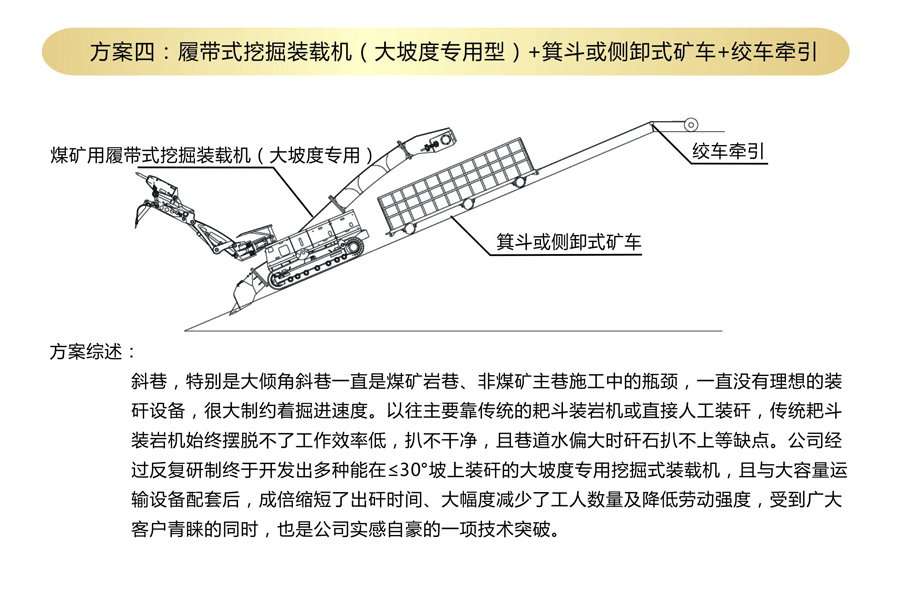 方案四:履帶式挖掘裝載機+箕斗或側(cè)卸式礦車+絞車牽引